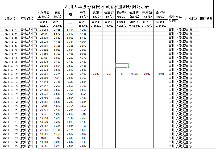 四川天華股份有限公司4月廢水監(jiān)測數(shù)據(jù)公示