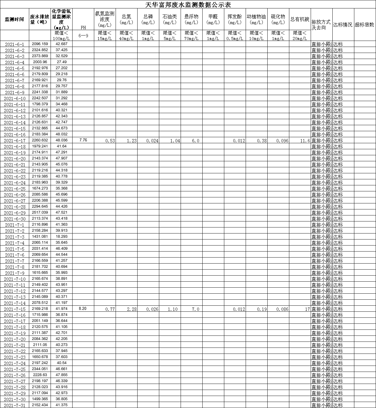 四川天華富邦化工有限責(zé)任公司6月、7月廢水監(jiān)測數(shù)據(jù)公示